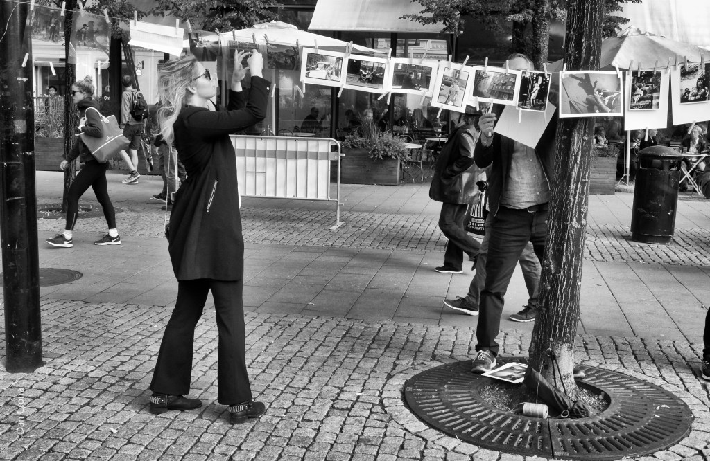 Många flanörer stannade till vid våra bilder – tror att vi var 13-15 st som hängde våra alster på ett hastigt uppspänt snöre. Får man verkligen göra såhär undrade någon?- vad glad jag blir sa en annan. Och det hela kändes lite busigt, men mest var det trevligt att träffa andra fotografer. Ser redan fram mot nästa gång.