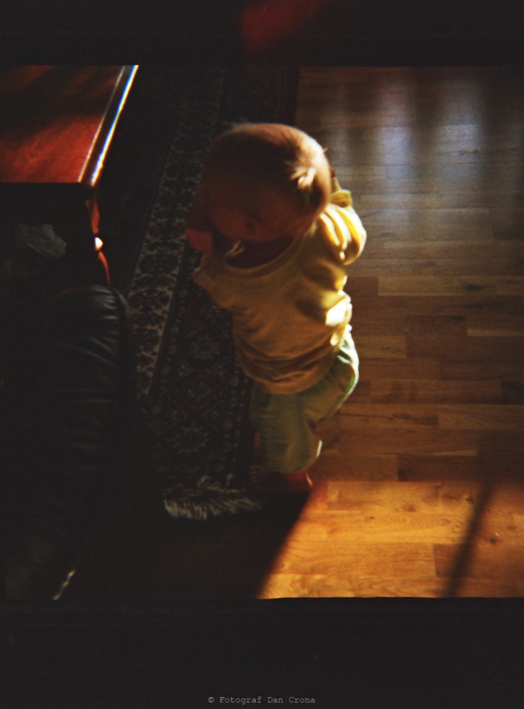 Jag går med min son. Han ser rätt liten ut på bilden och jag undrar om han ganska nyligen har lärt sig att gå och det ligger höstlöv på marken. Mina dammiga oskarpa bilder är ovärderliga idag – då när bilderna togs var det nog mest för att göra slut på filmen utan att slösa liksom för det ligger kundjobb på resten av rullen. Att lära sig gå är väl det som allt handlar om egentligen kom jag att tänka på.